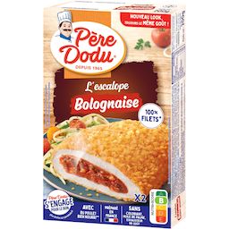 Les spécialités gourmandes de Père Dodu : une escalope de poulet 100% filets garnie d''une délicieuse sauce aux tomates parfumée et à la viande de bœuf, le tout enrobé d''une chapelure fine et croustillante. Elle fera fondre de plaisir toute la famille !