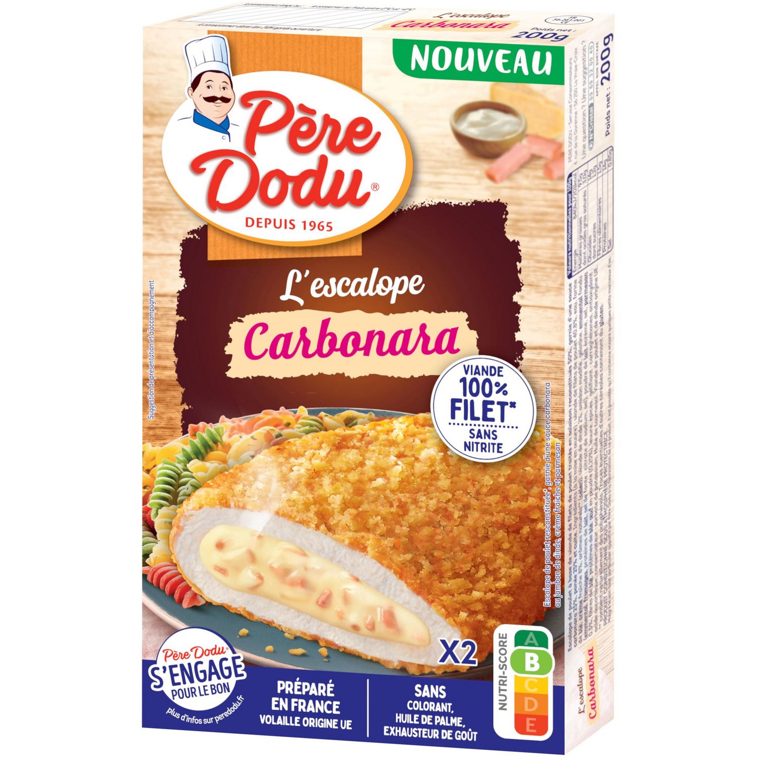 Les spécialités gourmandes de Père Dodu : Une escalope de poulet 100% filets garnie d''une onctueuse sauce carbonara à la crème, parmesan et bacon de dinde, le tout enrobé d''une chapelure fine et croustillante. Elle fera fondre de plaisir toute la famille !