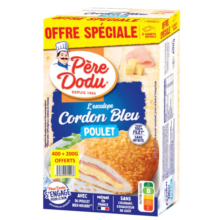Escalope Cordon Bleu Père Dodu : une tendre viande de poulet 100% filets, agrémentée de fromage fondant et d un savoureux jambon fumé de dinde sans nitrite, le tout enrobé d une chapelure croustillante. La garantie d un plat gourmand et facile qui plaît aux petits et aux grands !