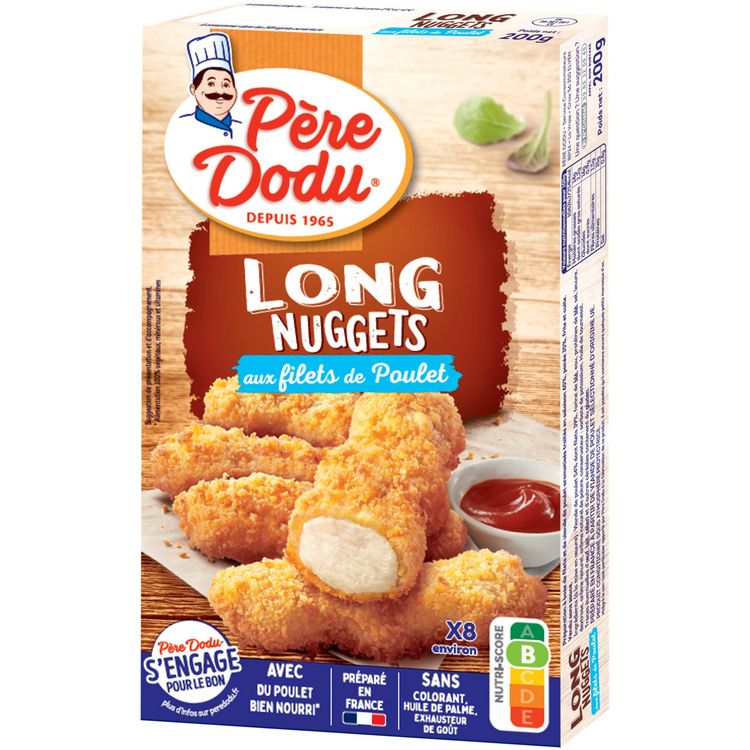 Le classique nuggets revisité par Père Dodu : une tendre viande de poulet enrobée d'une panure ultra-croustillante, dans un format plus allongé, facile à tremper dans vos sauces préférées.