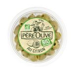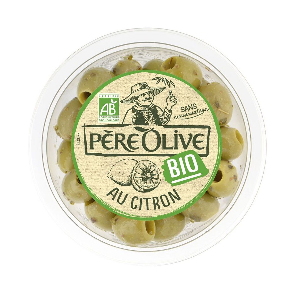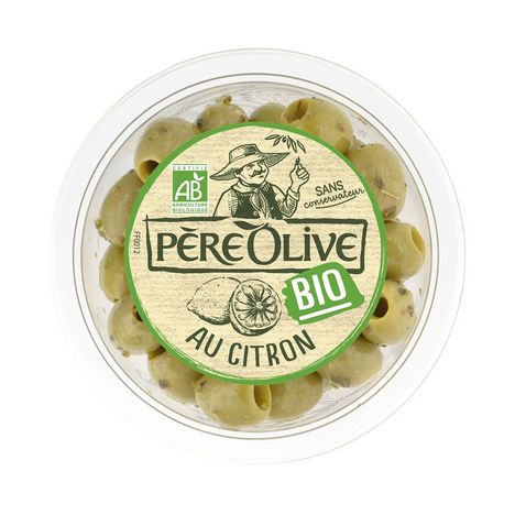 "Olives vertes dénoyautées* 86,3%, citron* 8,4%, sel, huile de tournesol*, origan*.