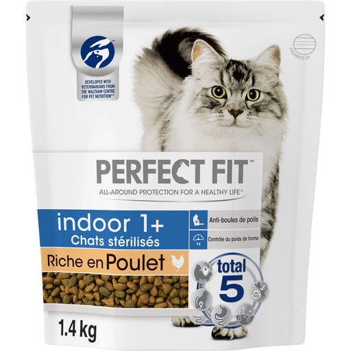 Les croquettes Perfect Fit™ Adult 1+ Indoor Chats Stérilisés sont disponibles en format 1,4 kg.