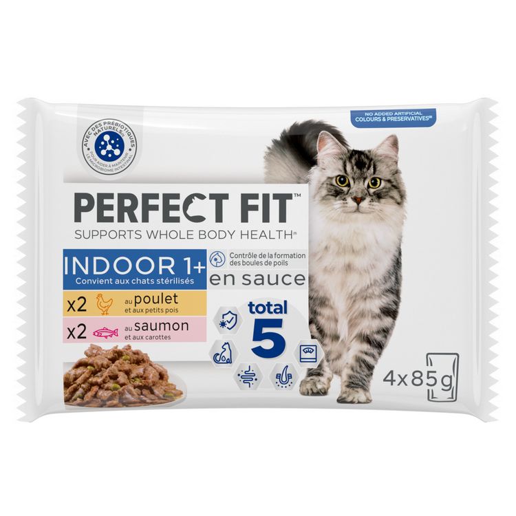 Les sachets fraîcheur Perfect Fit™ Indoor 1+ Chats Stérilisés sont disponibles en format 4x85g.