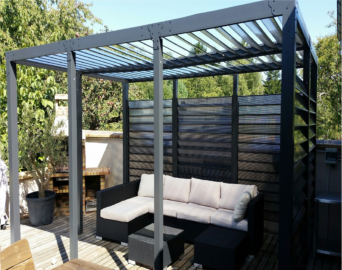 Créez un véritable espace de vie à l'entrée de votre maison ou jardin grâce à cette pergola à toit en aluminium et ventelles fixes. Installez un salon de jardin, un spa ou jacuzzi en dessous pour en profiter pleinement ! Design et esthétique, cette tonnelle est une véritable alternative au parasol ou store. Conçue en aluminium gris anthracite, cette pergola mesure 4.13m de long pour une largeur de 2.79m et hauteur de 2.40m. Facile à installer grâce à ses 4 poteaux latéraux de section 10x10cm, cette tonnelle résiste parfaitement aux intempéries. Équipée d'une structure bioclimatique, cette pergola permet de vous protéger de la chaleur en régulant la température.