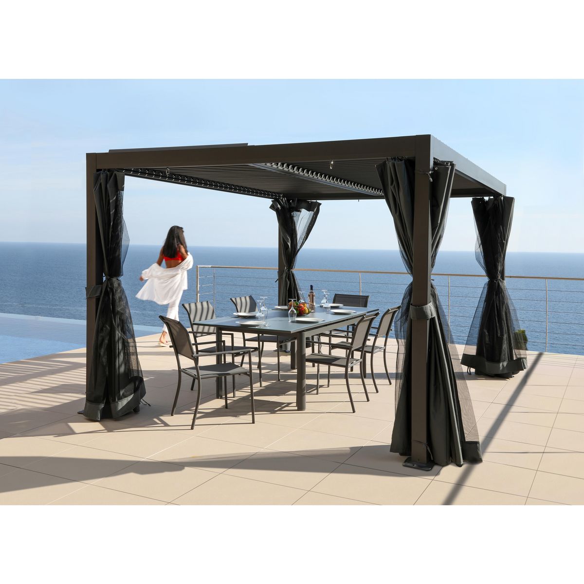 Structure aluminium, peinture époxy grise, lattes inclinables grises parfaitement étanche à l'eau, pieds 10x10 cm, son système de lames amovibles blanches permet d'adapter la lumière en fonction des rayons de soleil et d'offrir une aération optimale.