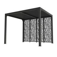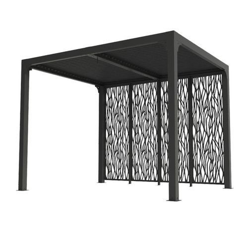 Pergola bioclimatique structure en aluminium protégée par un revêtement époxy, avec 52 lames à ouverture avec une manivelle avec 4 panneaux moucharabieh pour côté 3 m