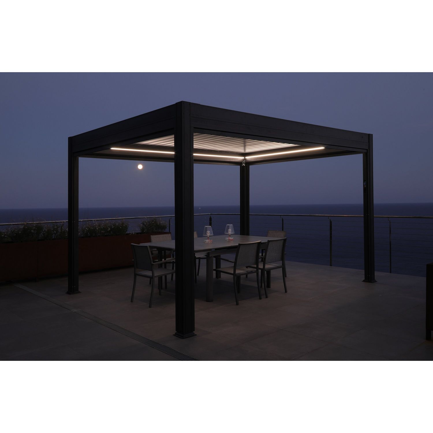 Structure aluminium, peinture époxy grise, lattes inclinables section 28x152 mm, pieds 135x135 mm, inclinaison des lames géré par télécommande, éclairage leds, munie de 4 rideaux électriques en 3 et 4 mètres anti-vent, évacuation de l'eau par gouttière latérale de 45x54 mm garantissant un parfait écoulement ensuite vers les poteaux, alimentation par énergie solaire.