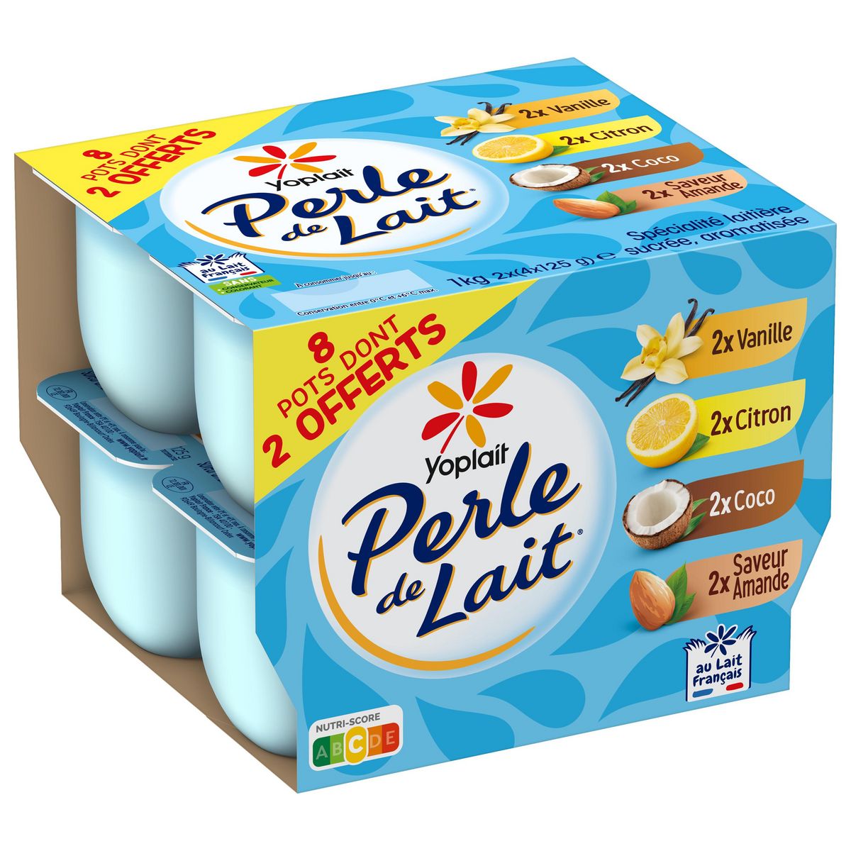 COCO LAIT écrémé - CREME - Sucre 6.5% - Noix de coco préparée 2% (Extrait de noix de coco, Noix de coco râpée) - Amidon transformé de riz et de maïs - Poudre de LAIT écrémé - Jus de citron à base de concentré – Arômes naturels - Épaississant : Gomme guar - Ferments lactiques (LAIT). CITRON LAIT écrémé - CREME - Sucre 8.6% - Eau - Citron 2% - Amidon transformé de riz et de maïs - Poudre de lait écrémé – Arômes naturels - Concentré des minéraux du LAIT - Ferments lactiques (LAIT) - Colorant : Curcumine. VANILLE LAIT écrémé - CREME - Sucre 9.5% - Eau - Amidon transformé de riz et de manioc - Poudre de LAIT écrémé - Jus de citron à base de concentré - Arôme naturel de vanille - Gousses de vanille épuisées - Colorant : Caroténoïdes - Ferments lactiques (LAIT). Décor : Écorces de vanille. SAVEUR AMANDE LAIT écrémé - CREME - Sucre 10% - Eau - Amidon transformé de riz et de maïs - Poudre de LAIT écrémé - Jus de citron à base de concentré - Arôme - Épaississant : Gomme guar - Ferments lactiques (LAIT). LAIT D’ORIGINE FRANCE