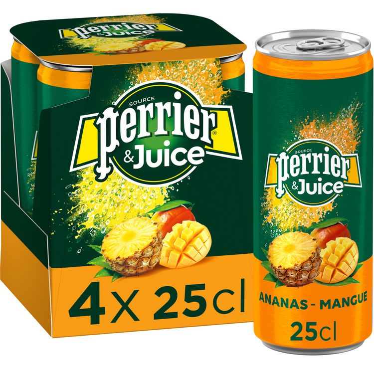 Ingrédients: Eau minérale naturelle gazéifiée Perrier 79%, jus de 4 fruits à base de concentré 17,2% (ananas 5,1%, mangue 5%, pomme 4,9%, citron 2,2%), sucre, arôme naturel, concentré (carotte et potiron), arôme naturel de mangue avec autres arômes naturels.