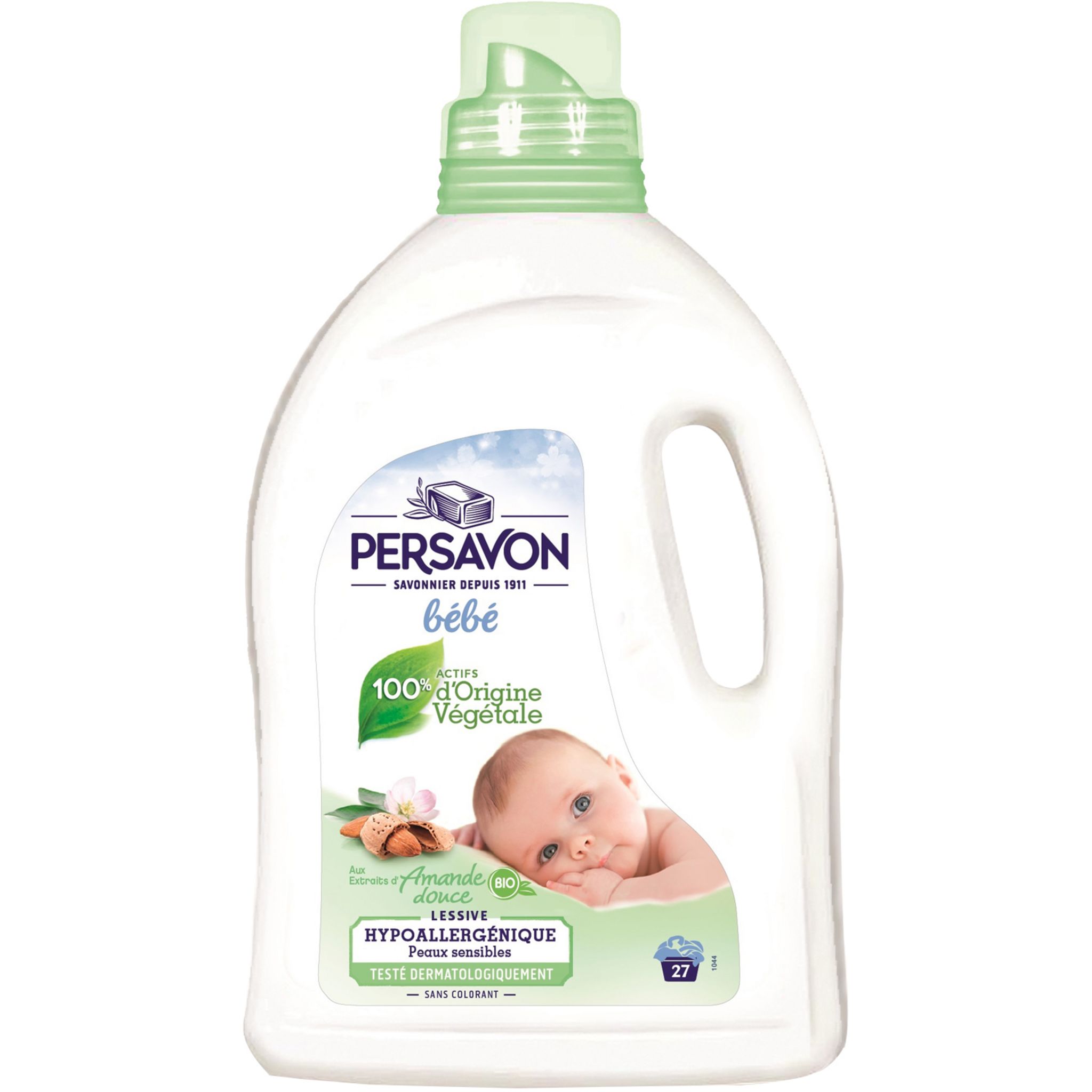 100% d'origine végétale, hypoallergénique, testé dermatologiquement pour les peaux sensibles, sans colorant, et aux extrait de parfum BIO Persavon lessive liquide bébé hypoallergénique amande douce 1.485L