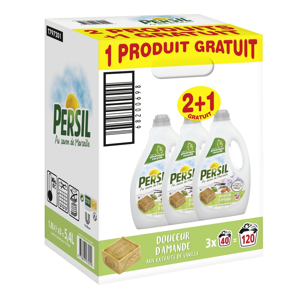 La lessive Persil Douceur d'Amande au savon de Marseille vous offre un soin complet pour un linge propre et frais. Format 3 x 40 Lavages.