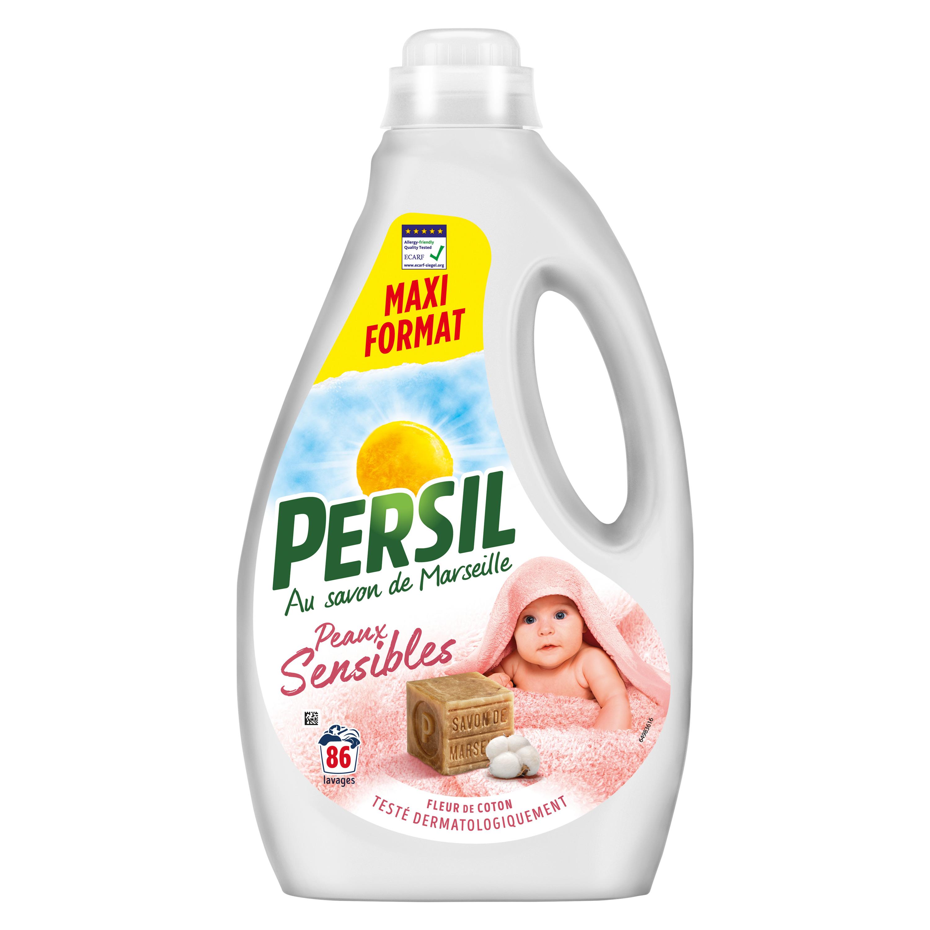 La lessive Persil Peaux Sensibles 86 Lavages est certifiée ECARF et testée dermatologiquement pour convenir à toutes les peaux, même les plus délicates de votre famille ! Son parfum hypoallergénique¹ Fleur de Coton vous enveloppera de douceur. 98% des mamans qui ont testé cette lessive la recommandent². La lessive Persil Peaux Sensibles au savon de Marseille vous offre un linge propre et frais. La lessive Persil Peaux Sensibles, c'est un petit prix et une efficacité dès 30 °C. Une lessive liquide dans une bouteille entièrement recyclable. Avec son savoir-faire centenaire, la lessive Persil au savon de Marseille rend votre linge propre et frais. Et, avec ses formats plus généreux et économiques, Persil prend aussi soin de votre porte-monnaie. Aujourd'hui, Persil s'adapte à tous vos besoins grâce à ses formats de lessives liquides, pastilles et poudre. Depuis 1906, Persil s'attache à respecter votre linge et votre peau grâce à sa formule au Savon de Marseille. Le Savon de Marseille présent dans toutes les lessives Persil provient d'une savonnerie centenaire située en Provence qui préserve depuis plusieurs générations un savoir-faire traditionnel. ¹Parfum de synthèse – Conçu pour minimiser les risques allergiques. ²Test mené sur un panel de 167 mamans – HTC 2024.