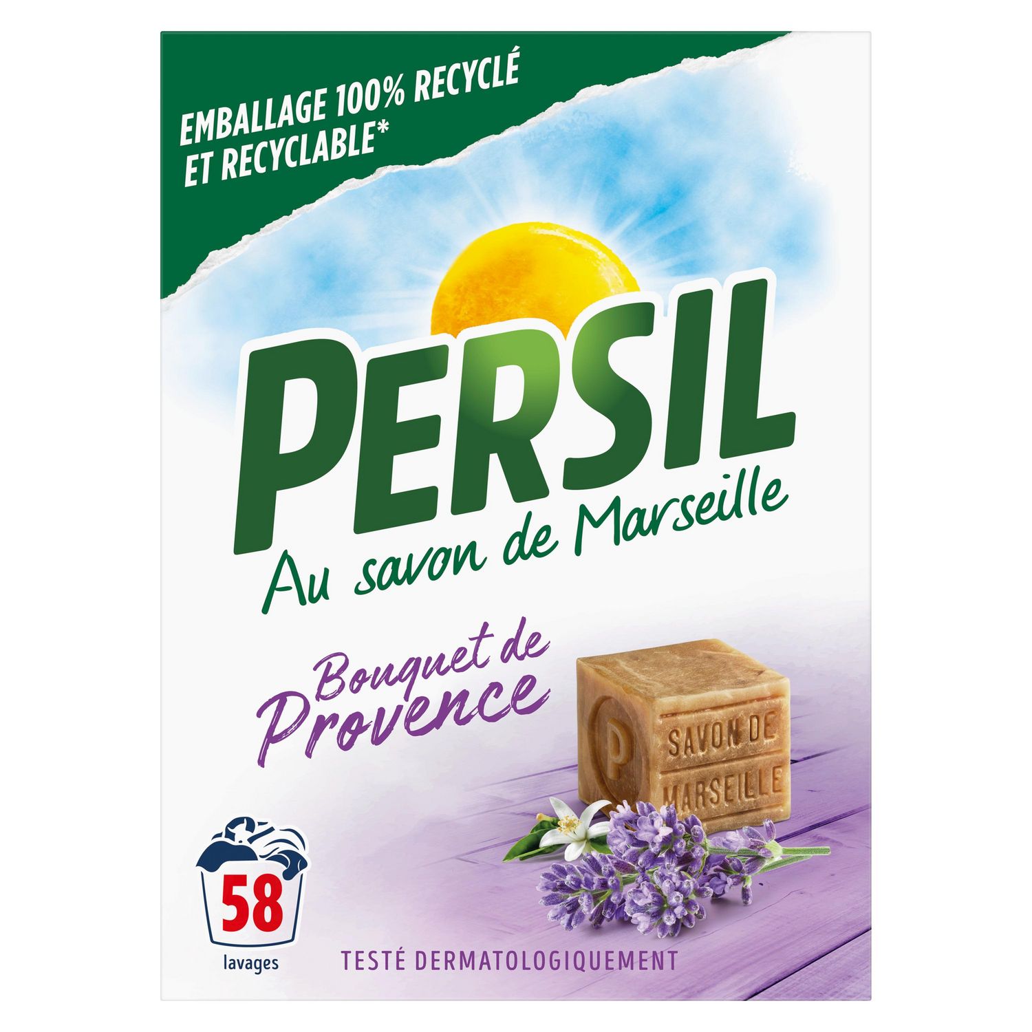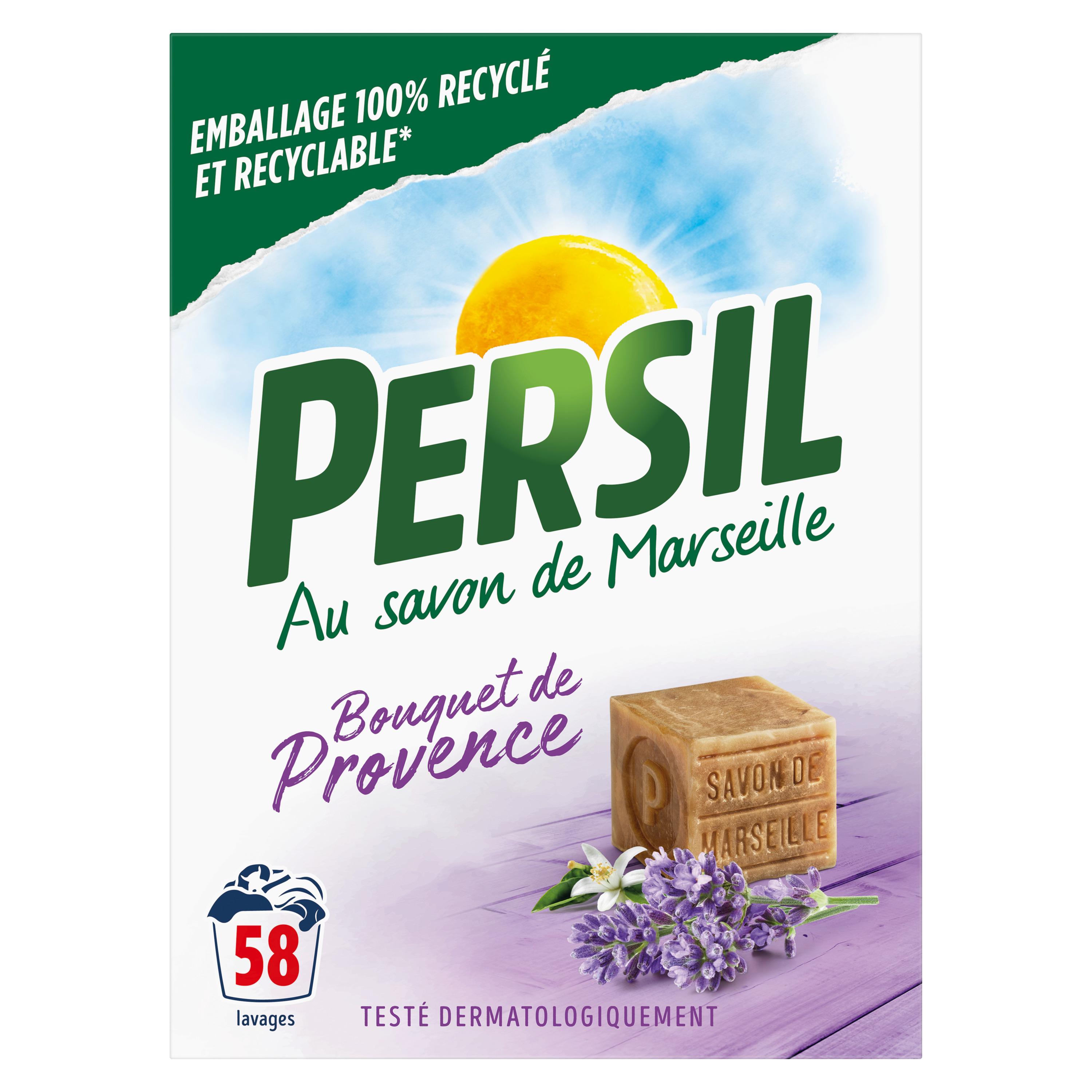 La lessive en poudre Persil parfum Bouquet de Provence 58 Lavages au savon de Marseille vous offre un soin complet pour un linge propre et frais.