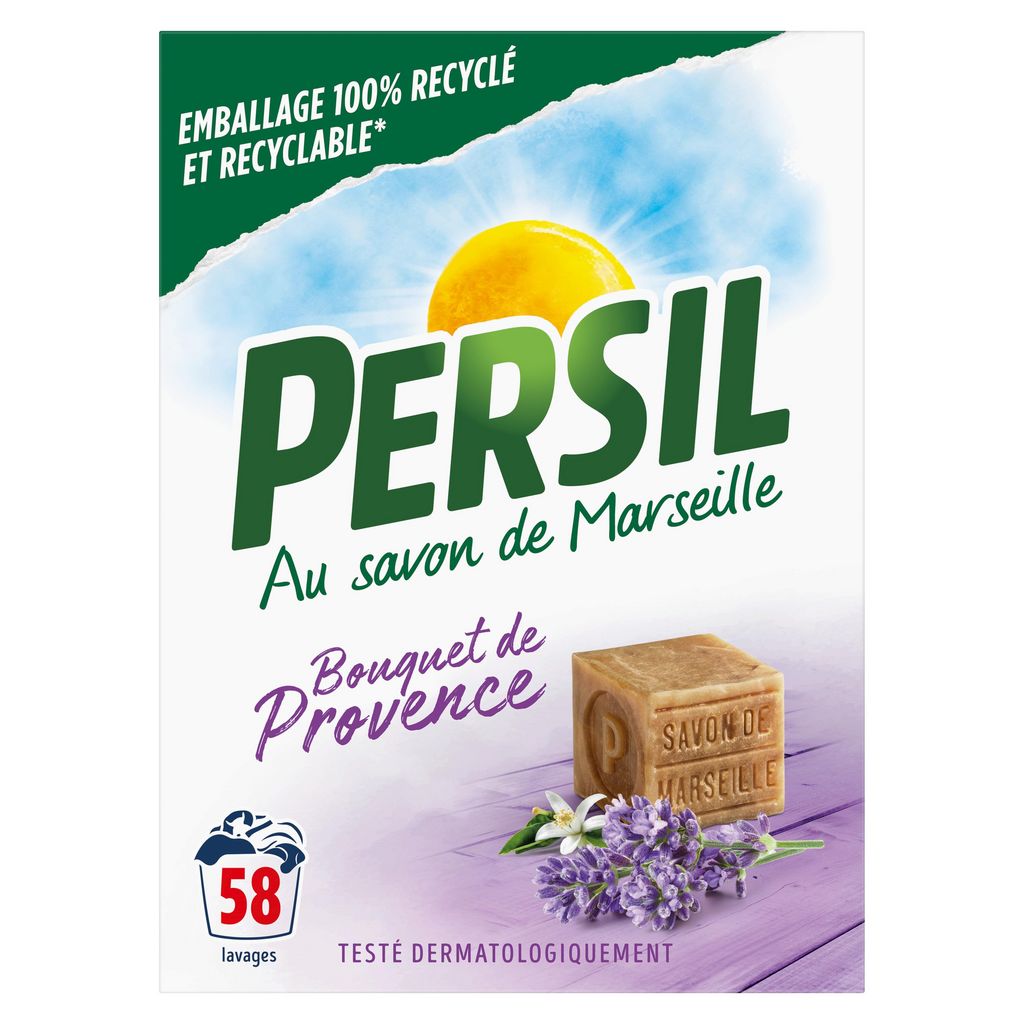 Vous cherchez une lessive poudre alliant pouvoir détachant, respect des peaux sensibles et parfum frais ? Découvrez la lessive poudre Persil Bouquet de Provence 58 Lavages au savon de Marseille : un soin complet pour un linge propre et frais. Enrichie en agents de blanchiment actifs, la poudre Persil Bouquet de Provence au savon de Marseille est parfaite pour laver votre linge blanc. Sa formule efficace dès 20 °C vous offre un linge d'une propreté impeccable. Et son parfum* fleuri vous transporte dans le sud de la France ! La lessive Persil est testée dermatologiquement pour respecter les peaux les plus sensibles. Et comme on aime la nature et la planète, notre boîte en carton est entièrement recyclable et fabriquée avec 90% de carton recyclé. Un petit prix pour une grande lessive, faites des économies avec Persil ! Avec son savoir-faire centenaire, la lessive Persil au savon de Marseille rend votre linge propre et frais. Et, avec ses formats plus généreux et économiques, Persil prend aussi soin de votre porte-monnaie. Aujourd'hui, Persil s'adapte à tous vos besoins grâce à ses formats de lessives liquides, pastilles et poudre. Depuis 1906, Persil s'attache à respecter votre linge et votre peau grâce à sa formule au Savon de Marseille. Le Savon de Marseille présent dans toutes les lessives Persil provient d'une savonnerie centenaire située en Provence qui préserve depuis plusieurs générations un savoir-faire traditionnel. *Parfum de synthèse.