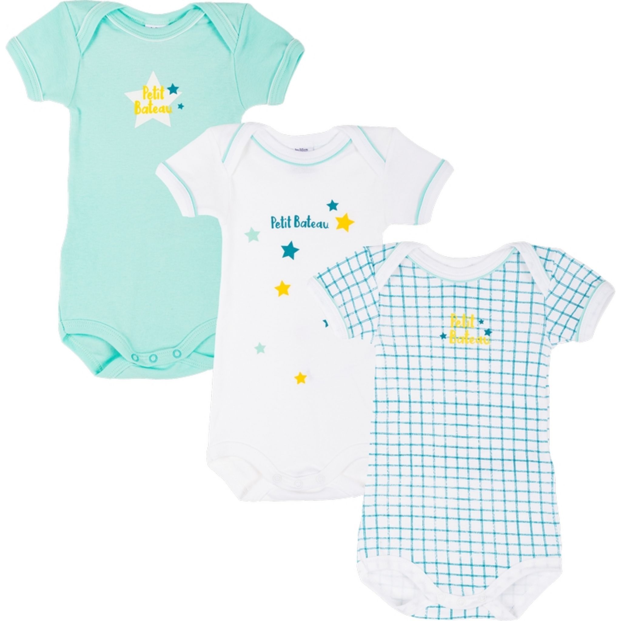 En savoir +Ce lot de 3 bodies PETIT BATEAU est parfait pour notre petit bébé préféré. Ces bodies manches courtes en coton épais affichent de beaux motifs , une encolure américaine pour un enfilage facile et une fermeture pressionnée à l’entrejambe. Ce lot est composé d'un body à rayures, et de deux bodies imprimé d'étoiles autour de la marque Petit Bateau.