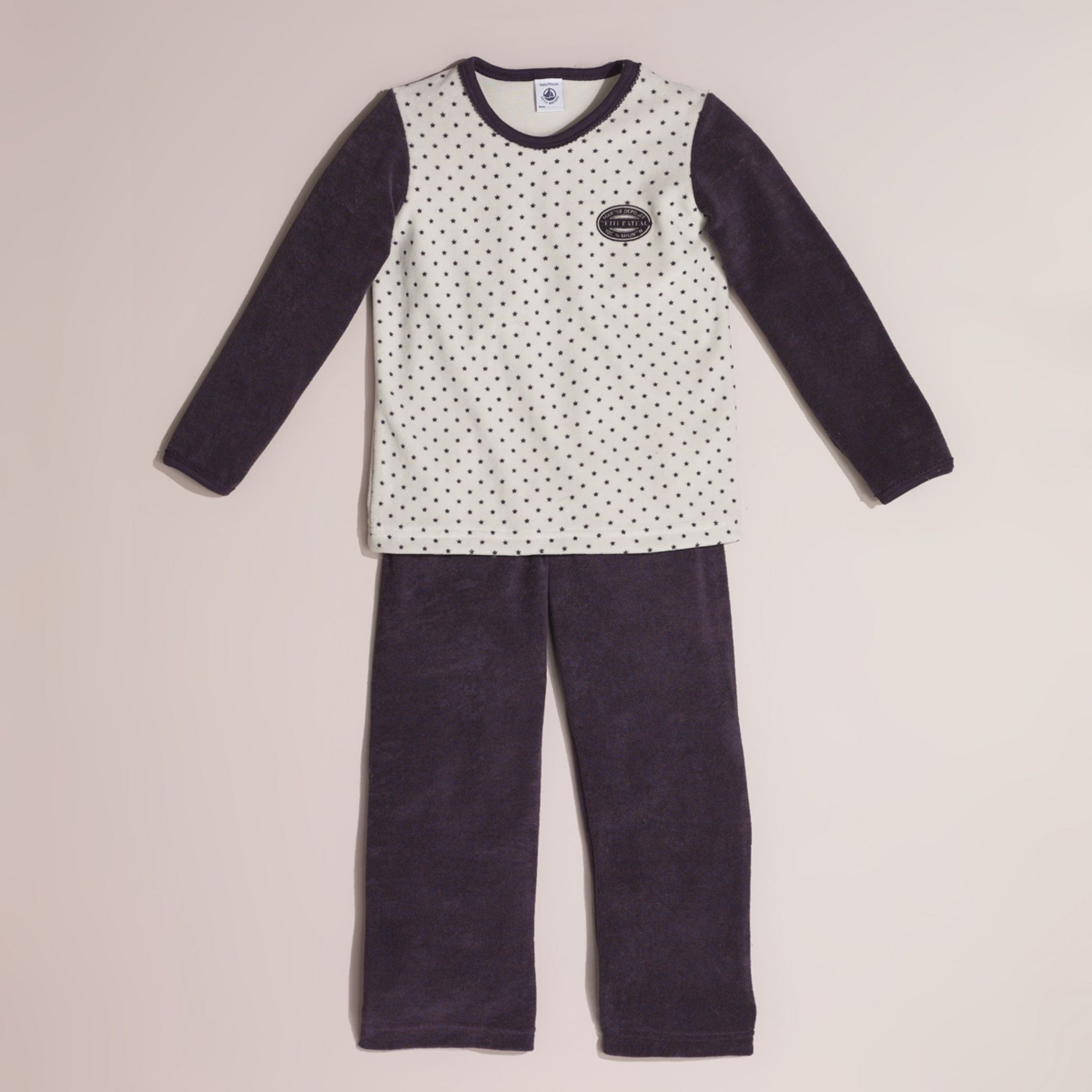 Offrez des nuits pleines de douceur et confortables à votre enfant grâce à cet élégant pyjama fille. Maille en bouclette éponge, très agréable à porter. Velours lisse, tout doux, sur le devant du haut. Haut : bicolore, manches longues et dos unis, motifs étoiles sur le devant. Finition fantaisi