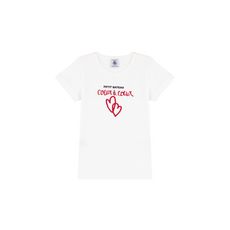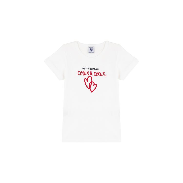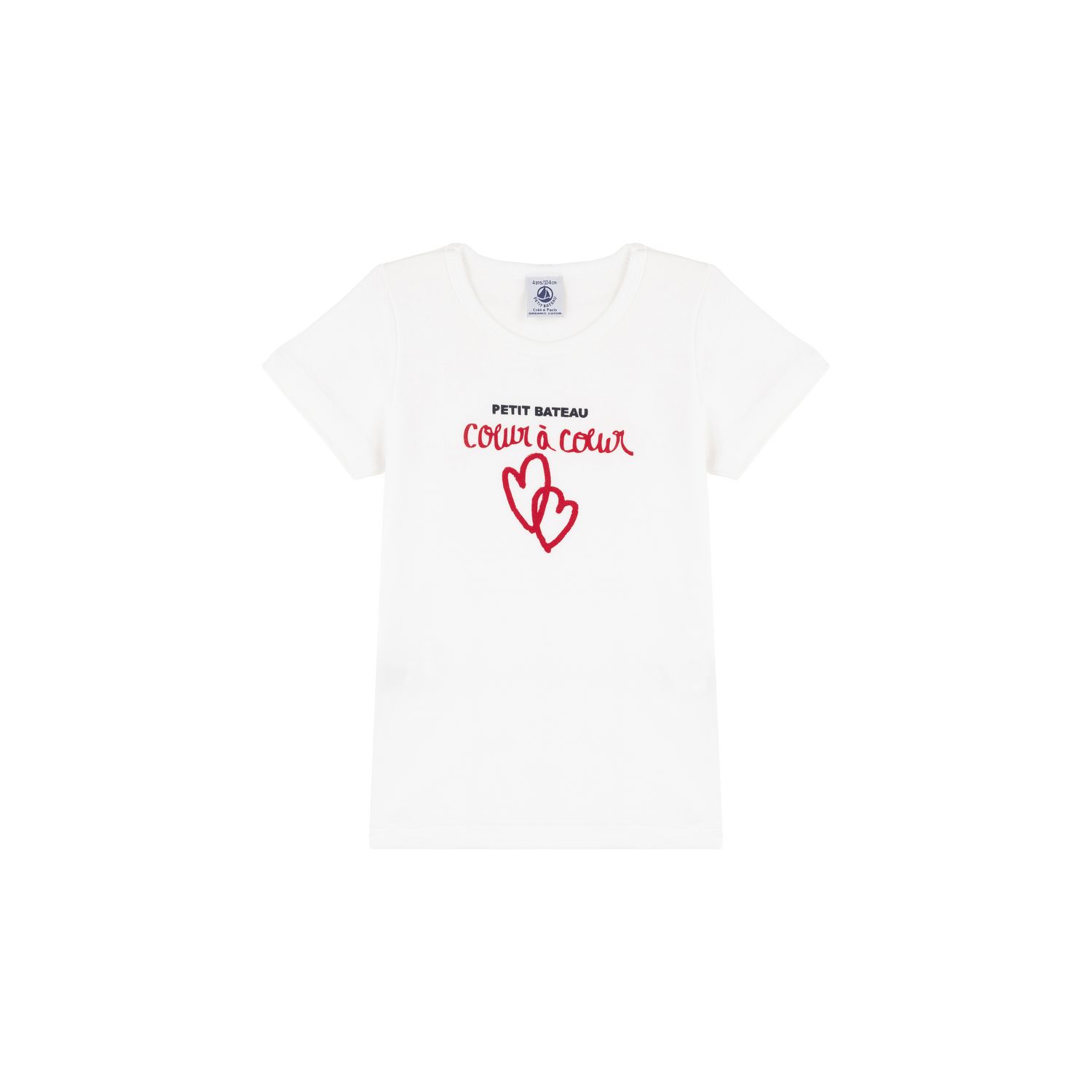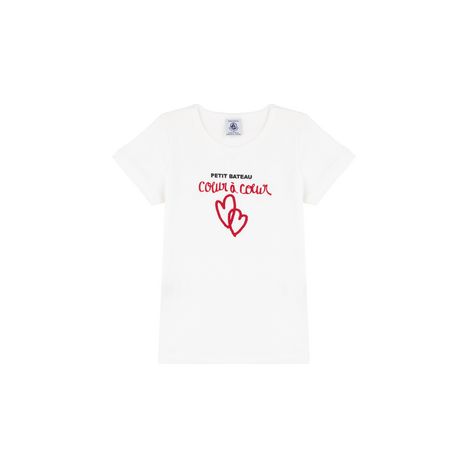 Petit bateau nous présente ce t-shirt manches courtes fille, idéal pour mettre en dessous d'un pull ou t-shirt manches longues. Il est imprimé de deux jolis cœurs rouge. Il est essentiellement composé de coton.