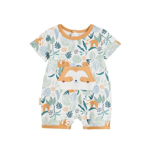 Avec son imprimé feuillage et ses petites touches camel et bleu, cette barboteuse invite votre petit bout à partir à l'aventure. Facile à enfiler et agréable à porter, elle est idéale pour les journées d'été. La petite poche kangourou avec son paresseux caché ajoute une note mignonne et ludique au l