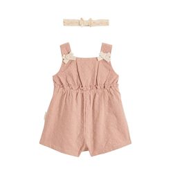 Un ensemble plein de charme pour les grandes occasions. La barboteuse, accompagnée de son bandeau assorti, crée une tenue délicate et élégante, parfaite pour une cérémonie. Le dos smocké et les noeuds aux bretelles ajoutent une touche chic. Une ouverture pressionnée à l'entrejambe pour faciliter l'h