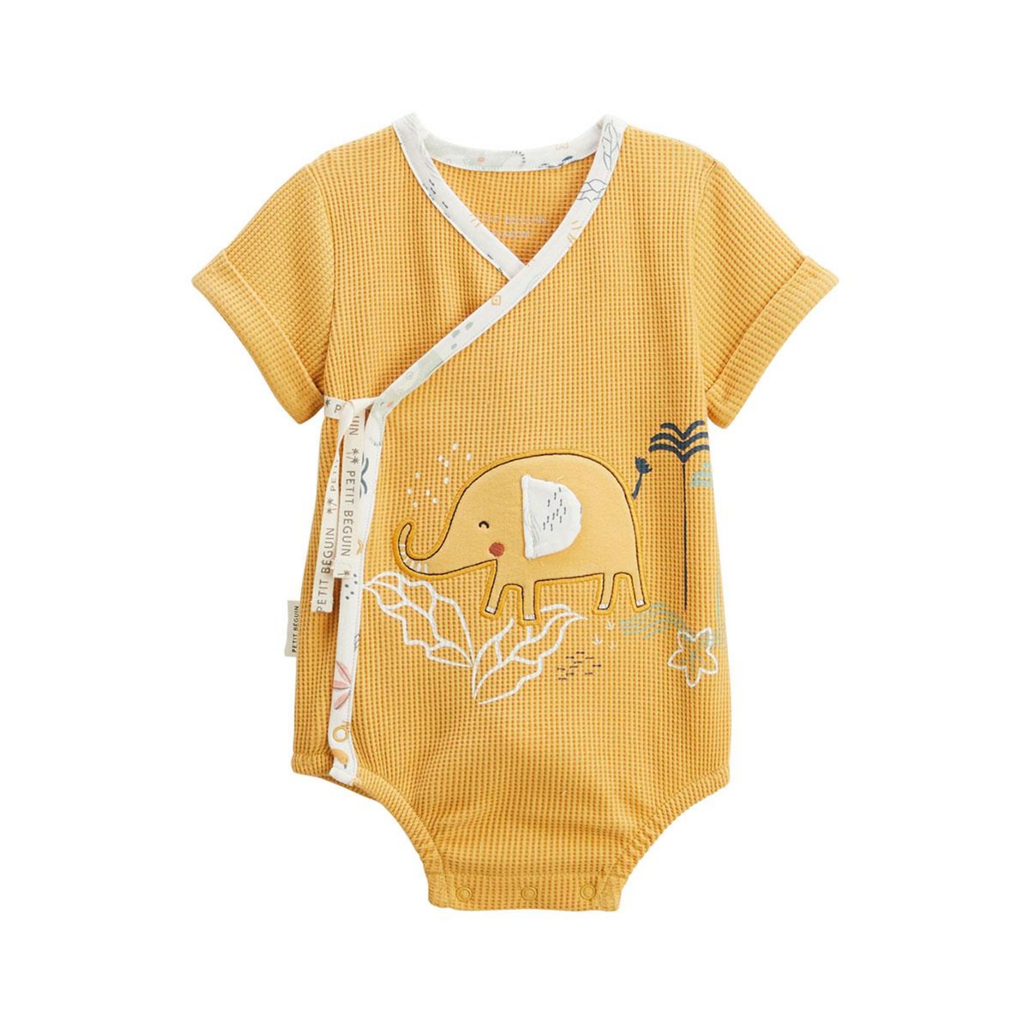 Cette adorable barboteuse croisée en nid d'abeille est une vraie pépite pour habiller bébé avec tendresse et confort. Son tissu doux et léger est parfait pour la peau fragile de bébé, tandis que le joli éléphant dessiné ajoute une touche d'originalité et de charme.Matière craquante en nid d'abeilleO