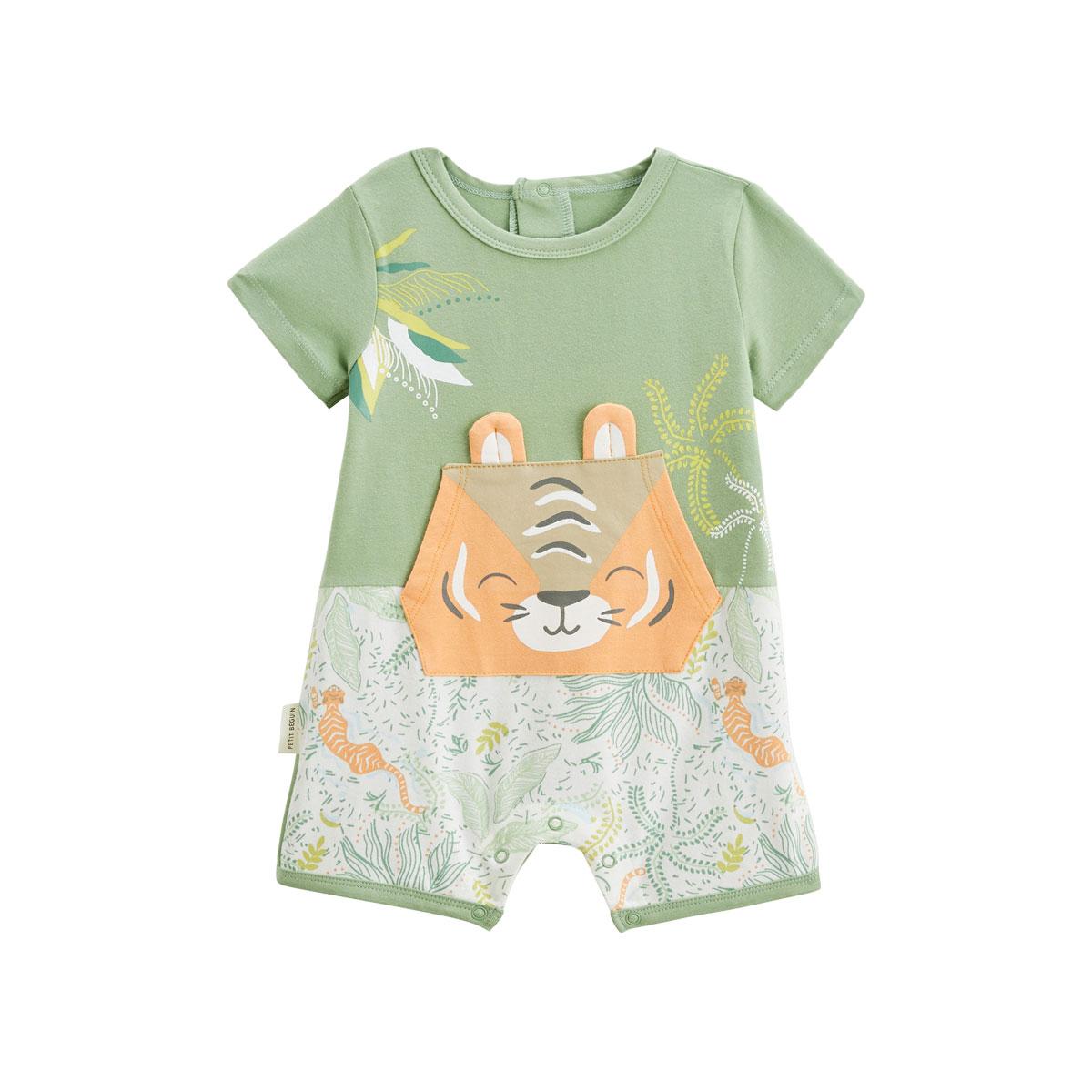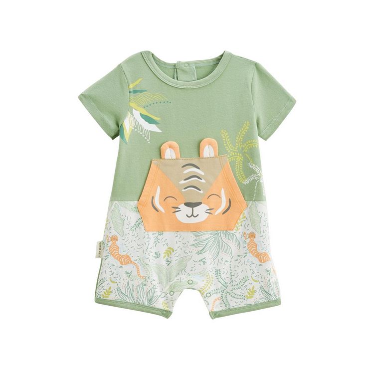 Toute douce dans ses tons écrus et verts, notre barboteuse nous fait craquer pour sa poche kangourou pratique et adorablement imprimée d'un petit tigre. Avec ses détails craquants et sa coupe confortable, elle accompagnera bébé partout, tout en étant à l'aise.Une ouverture pressionnée à l'entrejambe