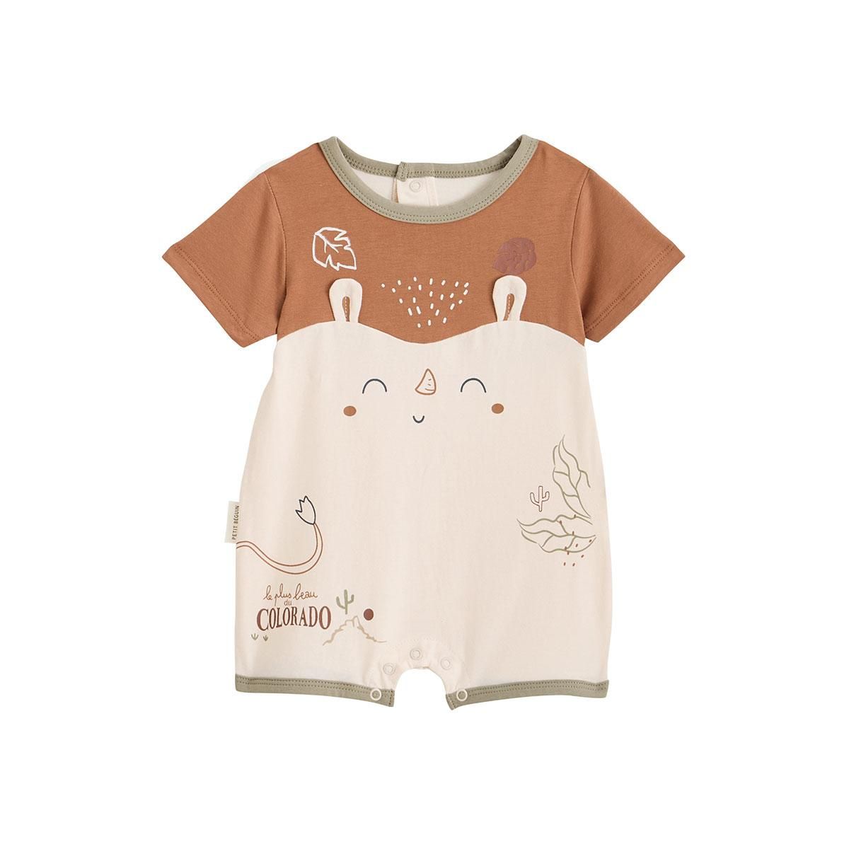 On craque pour cette adorable barboteuse aux teintes camel et sable, sublimée par de jolis motifs nature assortis à notre petit rhinocéros trop mignon. Elle offre confort et légèreté, parfaite pour les beaux jours. Son ouverture à pressions facilite l'habillage et les changes au quotidien. Produit l