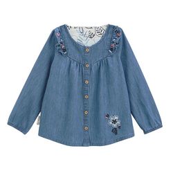 On revisite la altique veste en jean ! Craquez pour cette jolie chemise à manches longues avec ouverture boutonnée complète à l'avant. Le petit plus ? Les jolies fleurs bleues brodées, ses fronces et ses volants trop beaux sur les épaules ! Des volants qui nous font craquer Une ouverture complète su