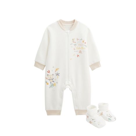 Un ensemble tellement chou pour bébé. Avec sa petite combinaison en molleton chaud et ses chaussons douillets, c'est idéal pour garder votre nouveau-né au chaud dès la sortie de maternité. Cette jolie combinaison toute douce n'a qu'à être enfilée au dessus d'un body et le tour est joué !Une nouvelle