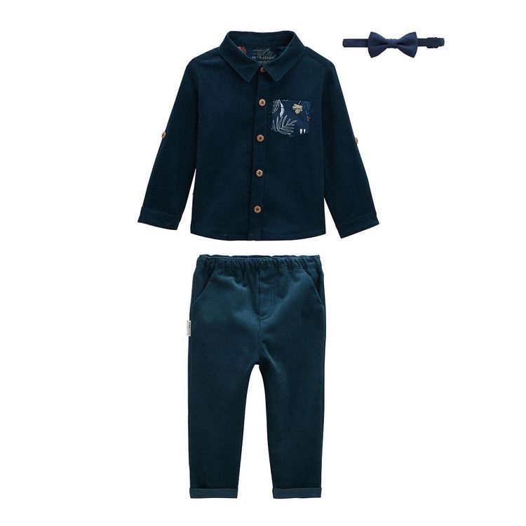 Le premier ensemble 3 pièces by Petit béguin ! Découvrez notre ensemble « fêtes » composé d'une jolie chemise en flanelle, d'un pantalon en velours côtelé et d'un nœud papillon trop mignon, tout cela dans de jolis tons bleus. Votre petit bout sera à croquer pour l'occasion ! Un ensemble 3 pièces = p