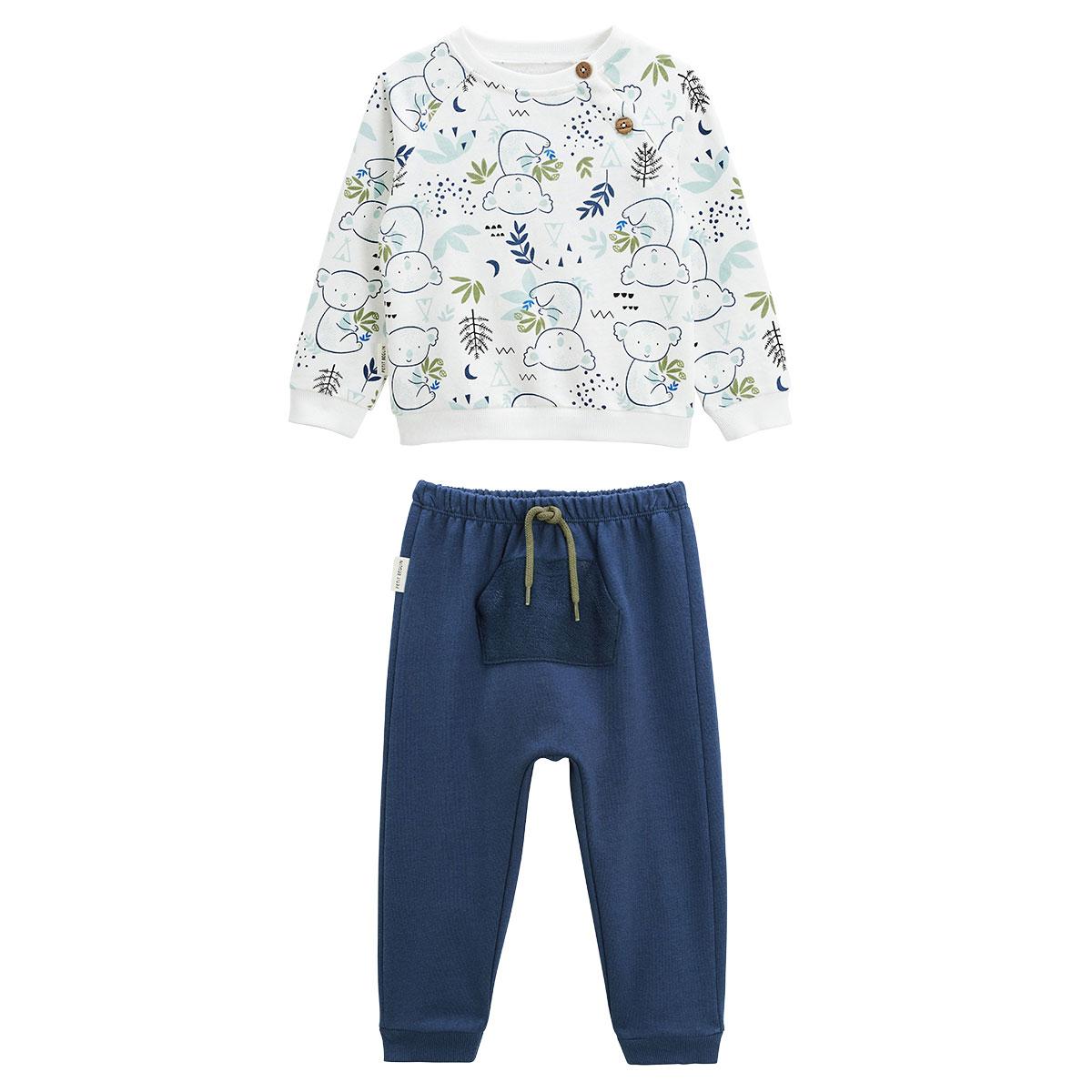 Quoi de mieux qu'un ensemble confortable pour bébé ? Monsieur Koala sera présent pour accompagner bébé à bouger au milieu de cette ambiance feuillage. Petit + : ce superbe pantalon bi-matière qui rajoute du pep's à ce look en molleton léger. Produit labellisé STANDARD 100 by OEKO-TEX ® (BJ020 189402