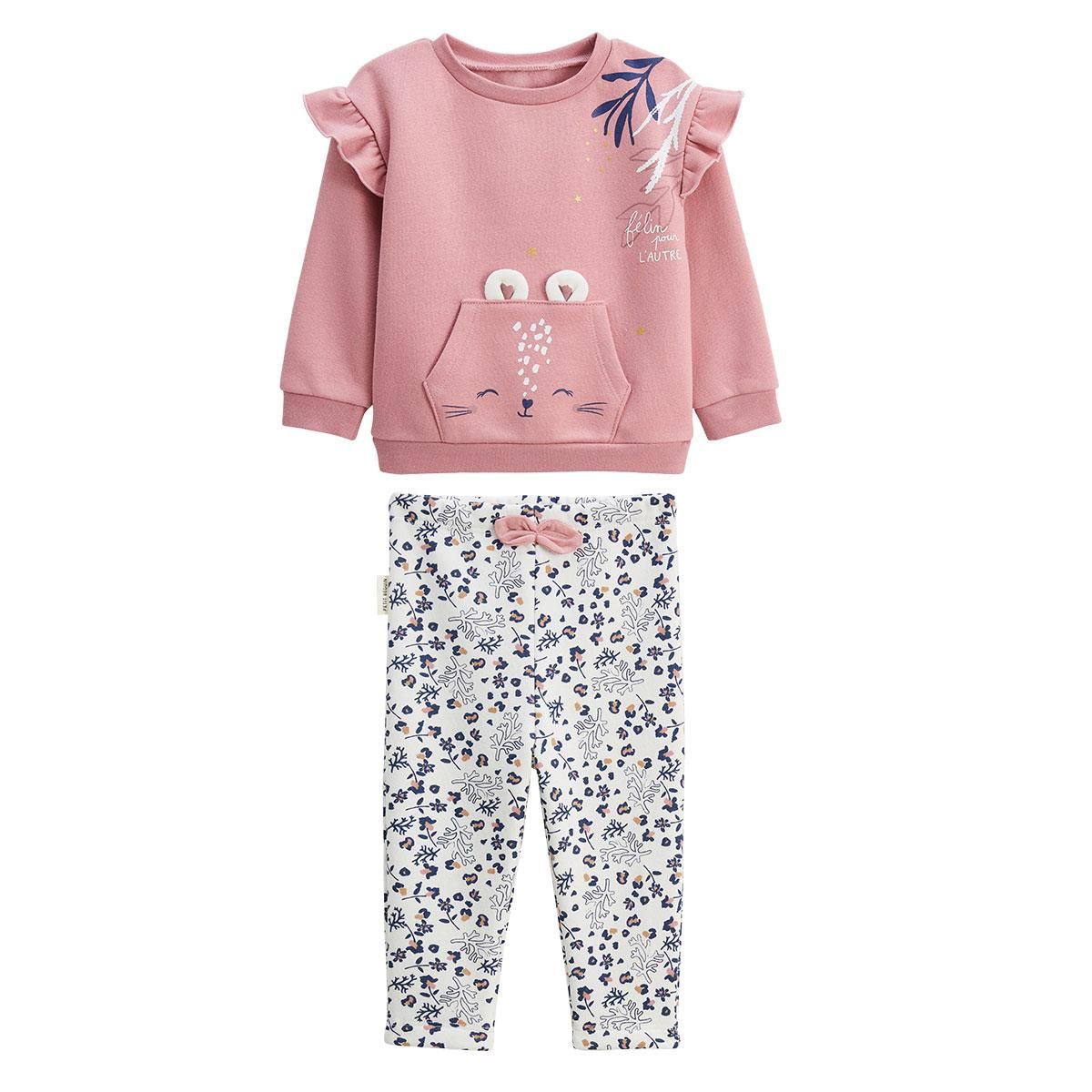 Un petit ensemble tout doux qui va faire craquer ! Le sweat molleton a des volants tout mignons sur les épaules, une poche kangourou bien pratique, et un visage rigolo dessiné. Le legging, avec son motif tendance, apporte une touche pleine de charme.Des volants sur le sweat, si tendanceUn legging en molleton ultra confortable avec taille élastiquéeProduit labellisé STANDARD 100 by OEKO-TEX ® (BJ.020.189402 TESTEX)Photos non contractuelles : les visuels sont fournis à titre illustratif. Les accessoires visibles ne sont pas inclus, l'offre concerne uniquement les pièces mentionnées dans le titre.