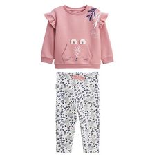 Un petit ensemble tout doux qui va faire craquer ! Le sweat molleton a des volants tout mignons sur les épaules, une poche kangourou bien pratique, et un visage rigolo dessiné. Le legging, avec son motif tendance, apporte une touche pleine de charme.Des volants sur le sweat, si tendanceUn legging en
