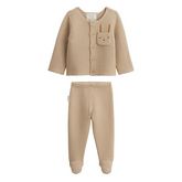 Un essentiel tout en douceur pour bébé. Ce joli ensemble en tricot sable a son petit gilet et son pantalon avec pieds pour garder bébé bien au chaud. Un mélange parfait de confort et de tendresse pour les premiers mois tout en délicatesse. On craque pour le petit lapin qui sort de la poche !Boutons