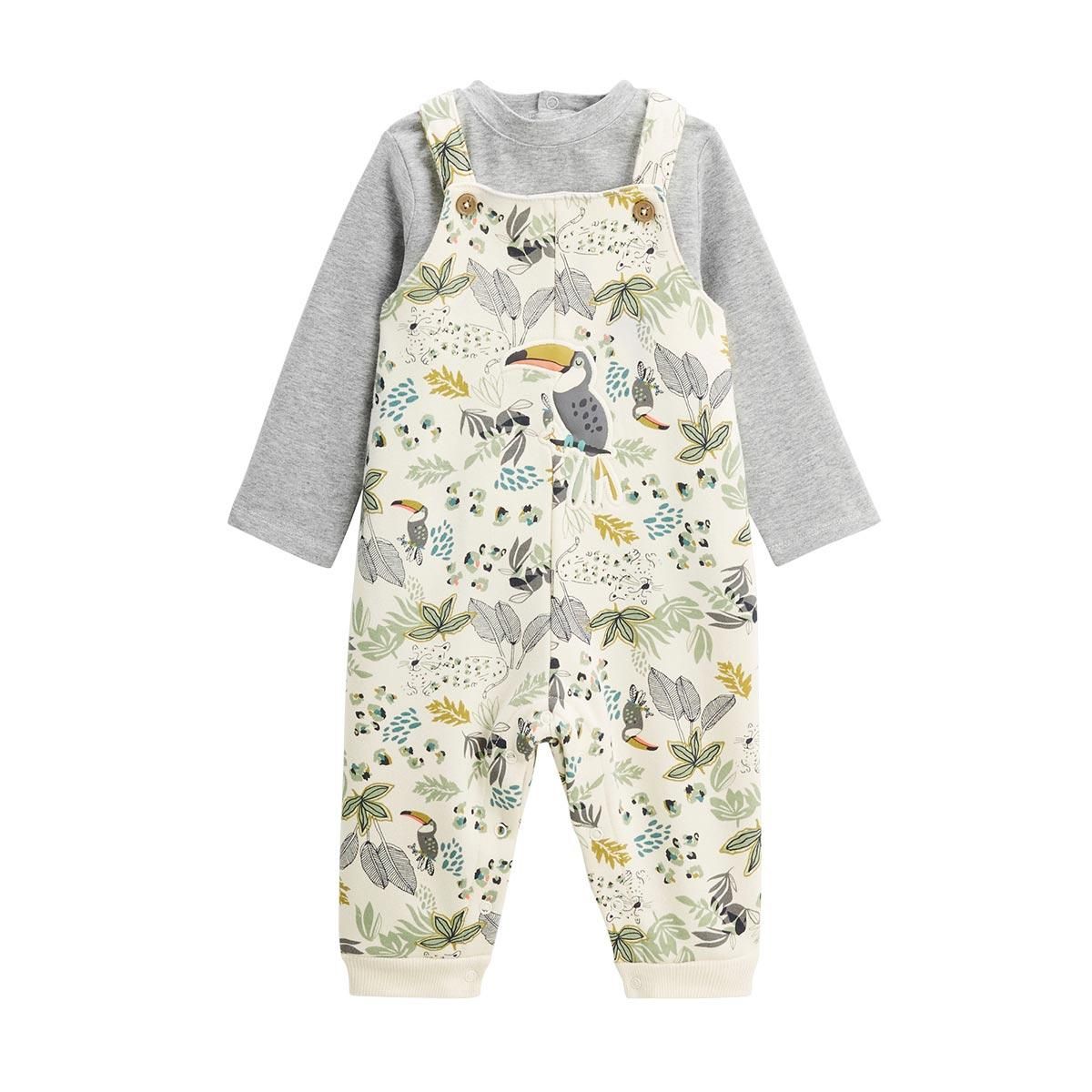 Un look craquant tout en douceur ! La salopette en molleton écru a un joli motif all over et son petit toucan trop chou, comme un aventurier au cœur de la jungle. Le t-shirt gris assorti complète l'ensemble avec simplicité. Confort, style et tendresse réunis !Des pressions au dos du t-shirt pour un