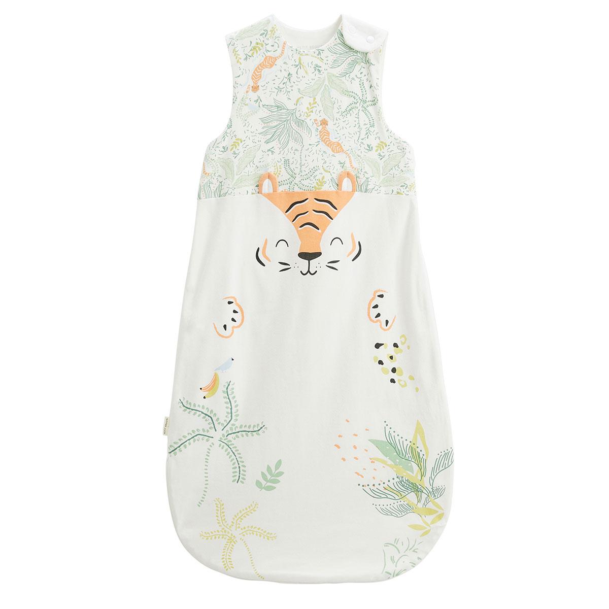 Plongez votre petit dans un univers tropical avec notre gigoteuse Kanha. Son joli écru et ses touches de vert apportent une fraîcheur estivale, tandis que la petite tête de tigre ajoute une dose de mignonnerie. Légère, elle accompagne bébé pour des nuits confortables et hyper agréables.Produit label