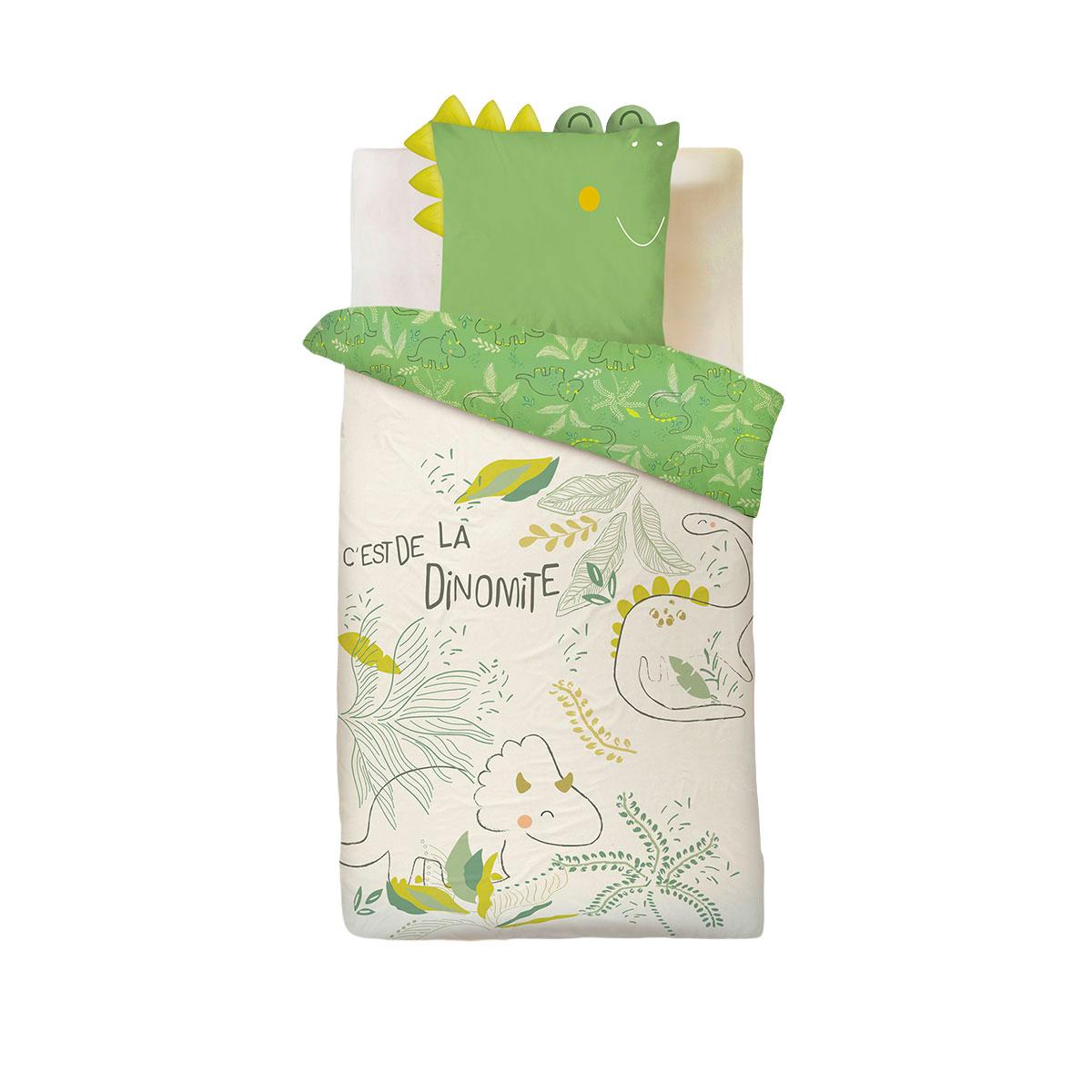 Une parure pleine de peps pour les petits fans de dinos ! La housse de couette entoure votre petit bout de créatures préhistoriques. La taie d'oreiller, avec ses cornes de dinosaure, apporte une touche fun et immersive. Au verso, un motif discret pour changer d'ambiance en un clin d'œil.Produit labe