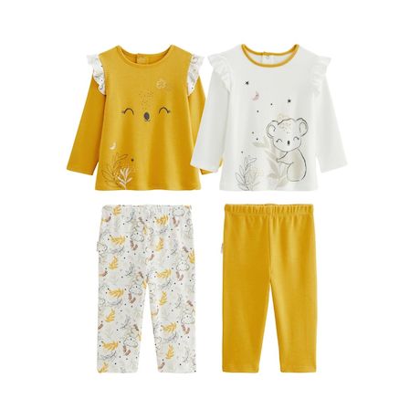 Toujours mieux par deux, on a pensé à vous ! Notre lot de 2 pyjamas va faire parti du dressing hivernal de votre petit bout avec ses belles couleurs écru et ocre qu'on adore. Le petit + : vous pourrez facilement les matcher et avoir un pyjama différent selon l'humeur de bébé !Produit labellisé STANDARD 100 by OEKO-TEX ® (BJ020 189402 TESTEX)Fonctionne en Mix & MatchDes jolis petits volants sur les hauts de pyjamasPhotos non contractuelles : les visuels sont fournis à titre illustratif. Les accessoires visibles ne sont pas inclus, l'offre concerne uniquement les pièces mentionnées dans le titre.