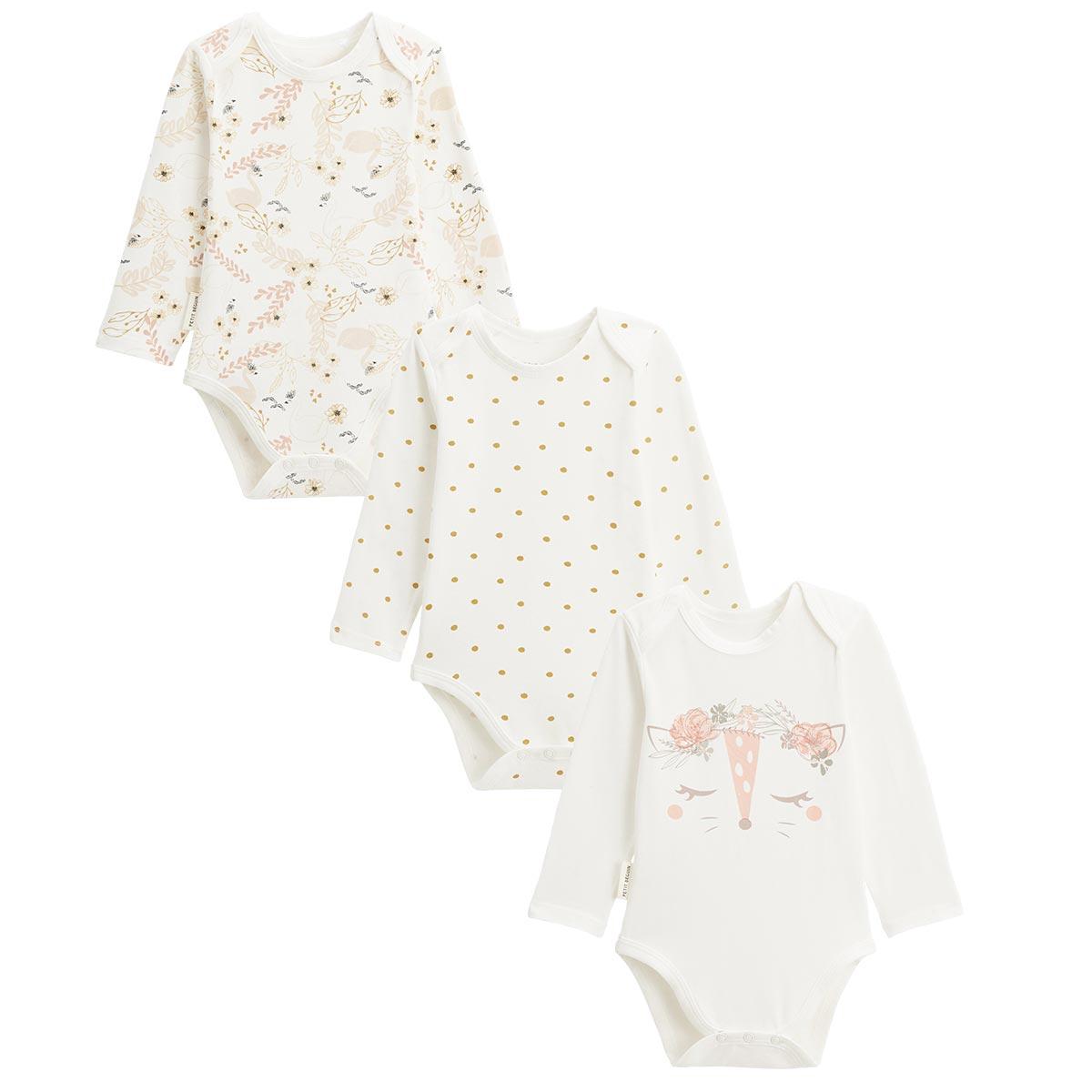 Un lot plein de charme : un body écru avec un visage de chat dessiné, un avec un imprimé délicat et un décoré de petits pois dorés. Tout doux, pratiques et faciles à assortir, ces bodies sont parfaits pour habiller bébé avec fantaisie et confort.Produit labellisé STANDARD 100 by OEKO-TEX ® (2309200