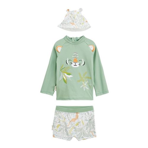 Voici l'ensemble de maillot de bain parfait pour les journées ensoleillées. Avec son haut, son boxer et son petit bob assorti, votre petit bout sera protéger comme il faut. On craque pour ses jolies couleurs vertes. Soyez rassuré, votre petit bout sera protégé du soleil grâce à son t-shirt à manches longues qui protège contre les UV. Attention, n'oubliez toutefois pas que porter ce maillot n'exclut en aucun cas l'utilisation de la crème solaire pour vos petits bouts, ainsi que le port des lunettes de soleil et d'un chapeau lors de toute exposition car seules les parties couvertes sont protégées ! T-shirt de protection contre les UV UPF 40+, matière conforme à UPF 50+ Son petit bob assorti pour une touche mignonne Un zip au dos pour faciliter l'enfilage ! Peut être porté avec une couche de bain Pour plus d'informations, voir les avertissements et recommandations dans l'onglet détails et entretien