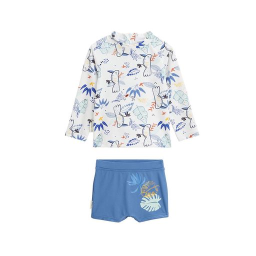 Craquez pour cet ensemble de maillot de bain ! Avec ton t-shirt et son petit boxer, il sera parfait pour protéger votre petit des rayons du soleil. On adore ces tons bleus qui donne un côté surfer ! Soyez rassuré, votre petit bout sera protégé du soleil grâce à son t-shirt à manches longues qui protège contre les UV solaires. Attention, n'oubliez toutefois pas que porter ce maillot n'exclut en aucun cas l'utilisation de la crème solaire pour vos petits bouts, ainsi que le port des lunettes de soleil et d'un chapeau lors de toute exposition car seules les parties couvertes sont protégées !T-shirt de protection contre les UV UPF 40+, matière conforme à UPF 50+Un zip au dos pour faciliter l'enfilage !Peut être porté avec une couche de bainPour plus d'informations, voir les avertissements et recommandations dans l'onglet détails et entretienPhotos non contractuelles : les visuels sont fournis à titre illustratif. Les accessoires visibles ne sont pas inclus, l'offre concerne uniquement les pièces mentionnées dans le titre.