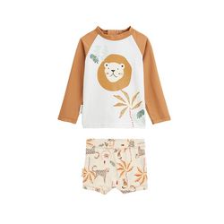 Le maillot de bain parfait pour votre petit roi de la savane. On craque pour son maillot et son boxer assorti dans de jolis tons camel et écru. Soyez rassuré, votre petit bout sera protégé du soleil grâce à son t-shirt à manches longues qui protège contre les UV solaires. Attention, n'oubliez toutef