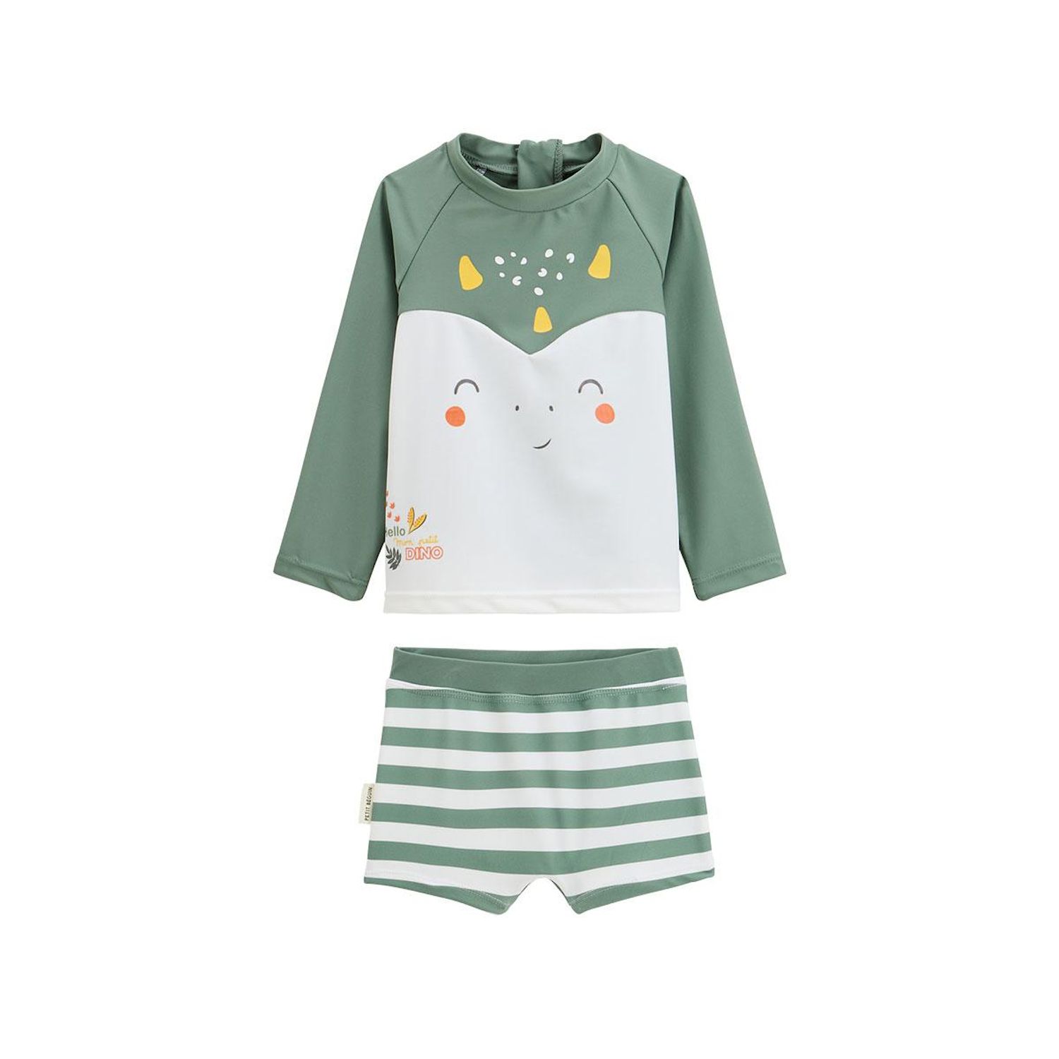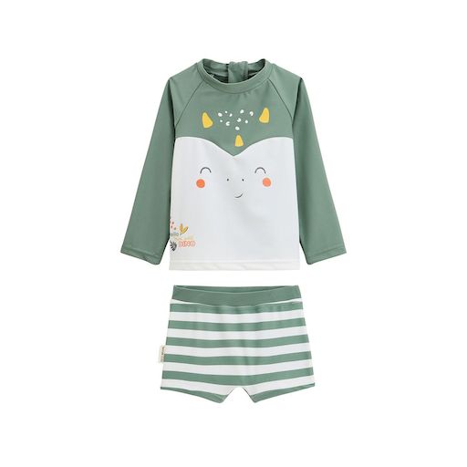 Prêt pour l'aventure ! Ce maillot de bain 2 pièces aux tons kaki associe son t-shirt et un boxer rayé pour un look aussi mignon que stylé. Parfait pour jouer, courir et s'amuser tout l'été, même les pieds dans l'eau. Soyez rassuré, votre petit bout sera protégé du soleil grâce à son t-shirt manches longues qui protège contre les UV. Attention, n'oubliez toutefois pas que porter ce maillot n'exclut en aucun cas l'utilisation de la crème solaire pour vos petits bouts, ainsi que le port des lunettes de soleil et d'un chapeau lors de toute exposition car seules les parties couvertes sont protégées ! T-shirt de protection contre les UV UPF 40+, matière conforme à UPF 50+ Un zip au dos pour faciliter l'enfilage ! Canon ce look rayé et ce visage trop chou Peut être porté avec une couche de bain jusqu'à la taille 36 mois incluse Pour plus d'informations, voir les avertissements et recommandations dans l'onglet détails et entretien Photos non contractuelles : les visuels sont fournis à titre illustratif. Les accessoires visibles ne sont pas inclus, l'offre concerne uniquement les pièces mentionnées dans le titre.