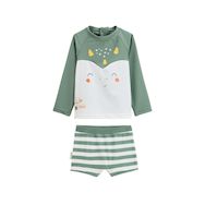 Prêt pour l'aventure ! Ce maillot de bain 2 pièces aux tons kaki associe son t-shirt et un boxer rayé pour un look aussi mignon que stylé. Parfait pour jouer, courir et s'amuser tout l'été, même les pieds dans l'eau. Soyez rassuré, votre petit bout sera protégé du soleil grâce à son t-shirt manches