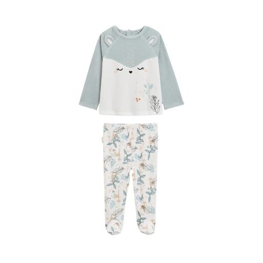 Un pyjama 2 pièces qui a tout l'air de ressembler à une grenouillère grâce à ses pieds antidérapants inclus ! Un pyjama deux pièces pour les petits qui veulent faire comme les grands. Les couleurs douces entre le bleu céladon et l'écru sont à tomber. Produit labellisé STANDARD 100 by OEKO-TEX ® (BJ020 189402 TESTEX) Un joli visage imprimé et des touches de doré trop canon Ouverture à pression au col du haut pour faciliter l'habillage En velours douillet Pieds avec picots antidérapants pour ne jamais glisser !