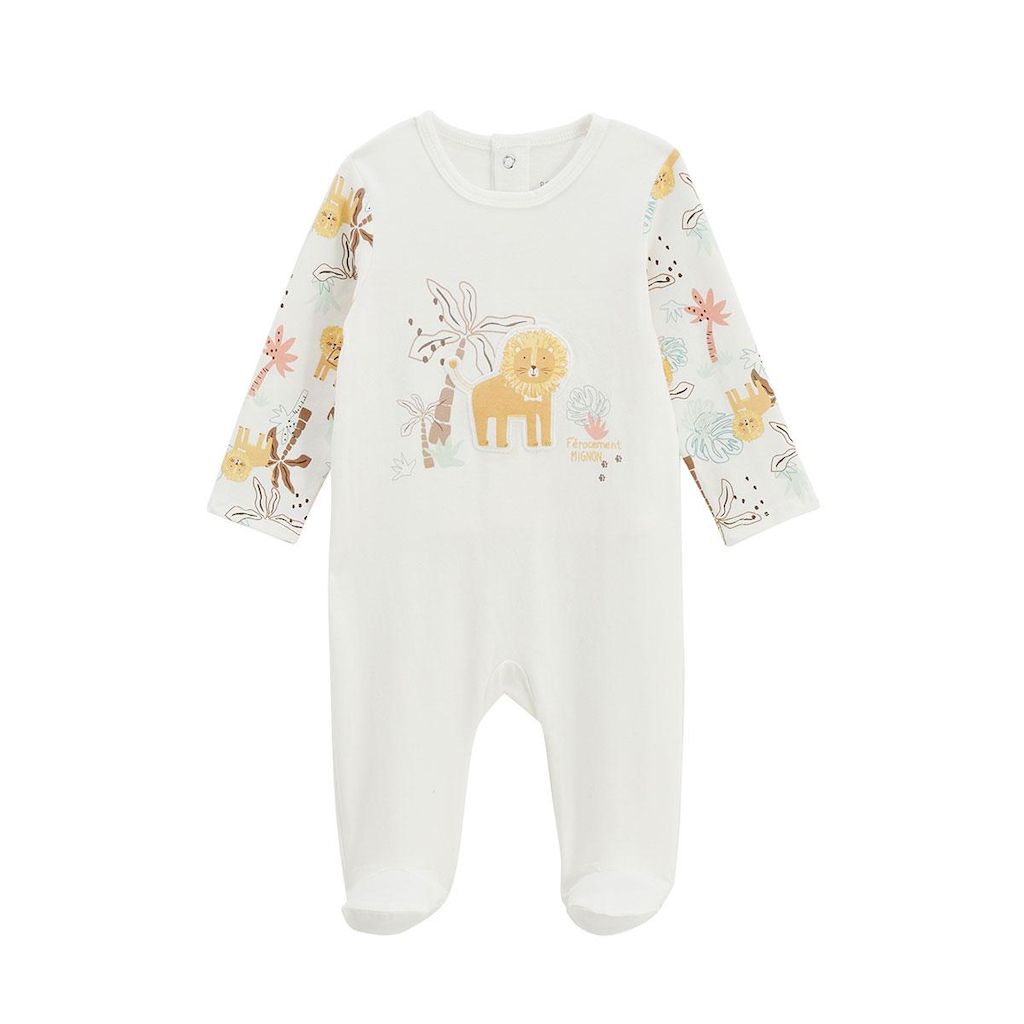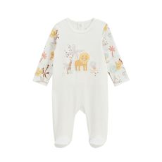 Notre pyjama accompagne bébé tout en douceur pour la nuit. Avec ses manches imprimées jungle et son petit patch lion sur le devant, il crée une ambiance rassurante et trop craquante. Confortable et facile à porter, c'est une pièce idéale pour de bonnes nuits. Pieds antidérapants à partir de la taill