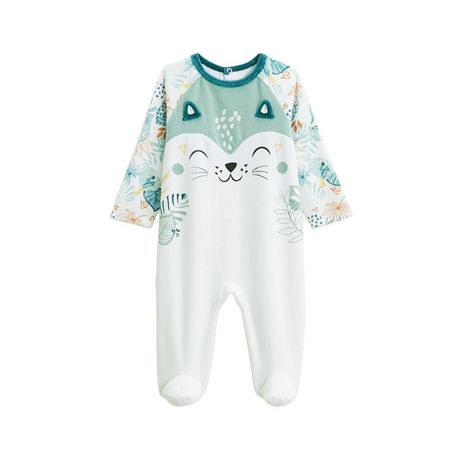 Comment ne pas craquer devant tant de mignonnerie ? Des couleurs douces pour de jolies nuits. Un petit visage de lionceau se dessine parmi les feuillages. Alors, vous craquez ? Pieds antidérapants à partir de la taille 12 mois -inclus- Ouverture par pressions au dos Produit labellisé STANDARD 100 by