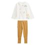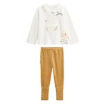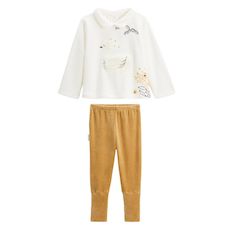 Un pyjama tout doux dans les tons ocre et écru, idéal pour les nuits fraîches. Le haut avec son col claudine et son petit cygne trop chou, s'associe à un pantalon avec pieds retroussables pour suivre les pas de bébé. Confort, style et praticité réunis dans un ensemble pensé pour cocooner.Produit lab