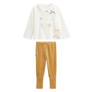 Un pyjama tout doux dans les tons ocre et écru, idéal pour les nuits fraîches. Le haut avec son col claudine et son petit cygne trop chou, s'associe à un pantalon avec pieds retroussables pour suivre les pas de bébé. Confort, style et praticité réunis dans un ensemble pensé pour cocooner.Produit labellisé STANDARD 100 by OEKO-TEX ® (2309200 CENTEXBEL)Un pyjama deux pièces pour faire comme les grands !Des pieds retroussables avec antidérapants pour garder les pieds au chaudCol claudine et patch bouclette pour un t-shirt trop tendancePhotos non contractuelles : les visuels sont fournis à titre illustratif. Les accessoires visibles ne sont pas inclus, l'offre concerne uniquement les pièces mentionnées dans le titre.