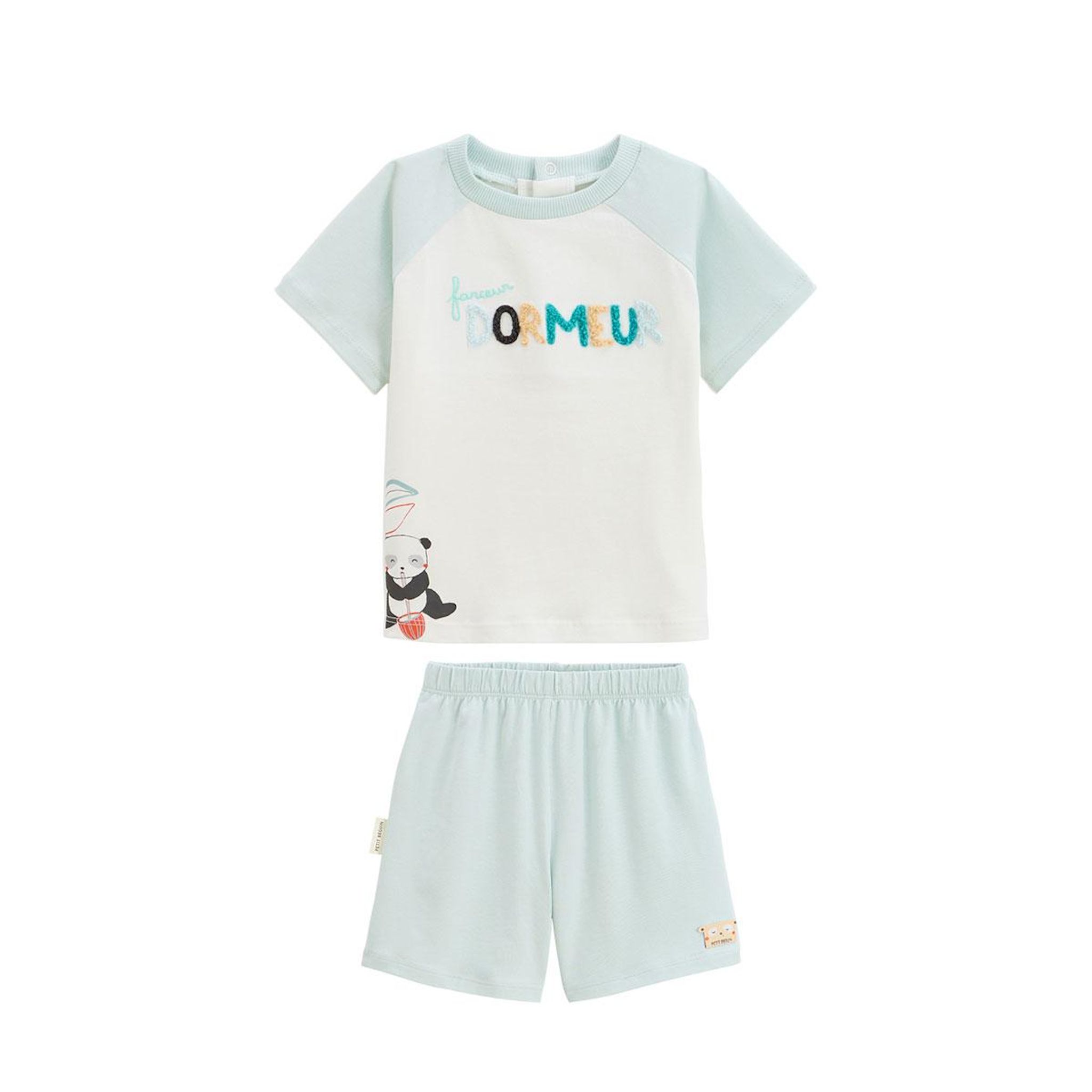 Ce pyjama tout doux est parfait pour accompagner les nuits calmes. Le t-shirt aux tons écru et vert d'eau, avec sa petite tête de panda imprimée, s'associe à un short uni confortable. Un ensemble simple, mais avec une touche de style. Ouverture par pressions au dos Écriture en relief bouclette, pour