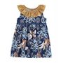 Entrez dans l'ambiance « cérémonie » et découvrez tous les détails de cette sublime petite robe. Nos stylistes se sont lâchées. : feuillages et volant en broderie anglaise couleur ocre sur un beau fond bleu marine. La taille est ornée d'un joli galon, vous allez adorer !Un joli col à volants en brod